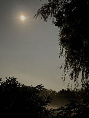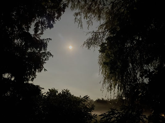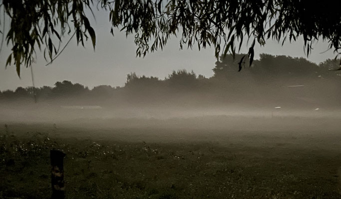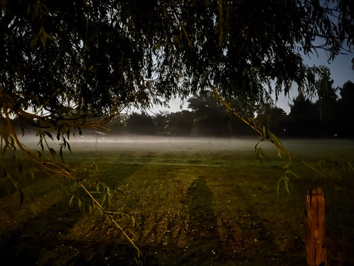 Einen Abend nach dem tollen Blutmond - Vollmond in totaler Mondfinsternis - stehe ich unter meiner Weide und das Straßenlicht wirft meinen Schatten auf die Koppel, die gerade zunehmend im Nebel versinkt. Ruhe. Fast. Die Hirsche brunften. Laut. Sehr. Herbstzeichen.